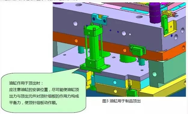 在此類應(yīng)用中,應(yīng)注意油缸的安裝位置,盡可能使油缸頂出力與頂出元件對(duì)頂針組板的作用力構(gòu)成平衡力系,減少頂針組板動(dòng)推板導(dǎo)柱的傾覆力,使頂針組板動(dòng)作順。